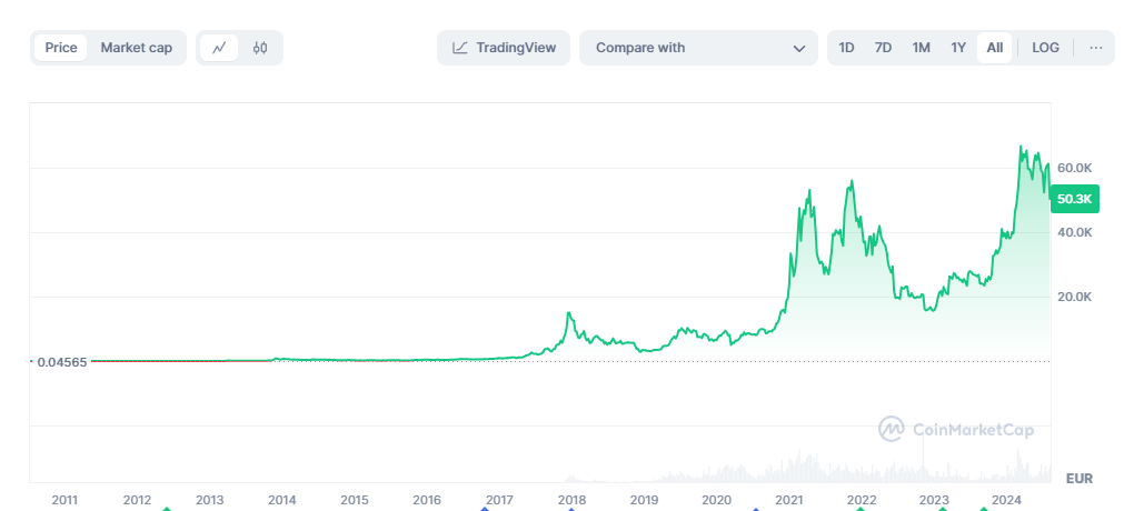 Zie onder een grafiek van de Bitcoin koers over 13 jaar tijd. Bitcoin is een blijvertje! (Bron: CoinMarketCap)